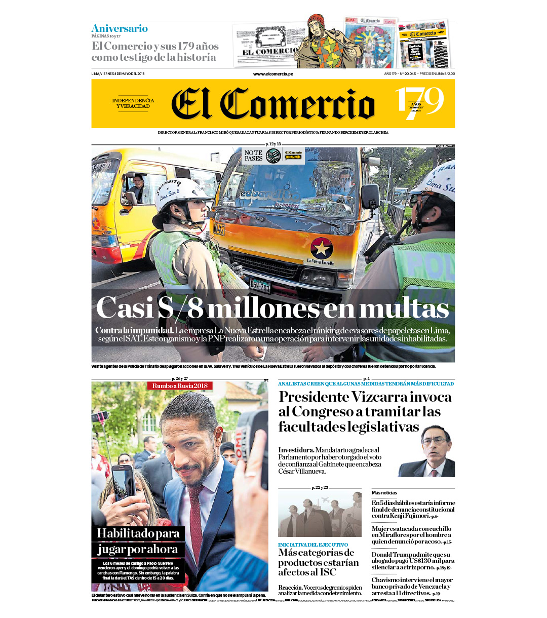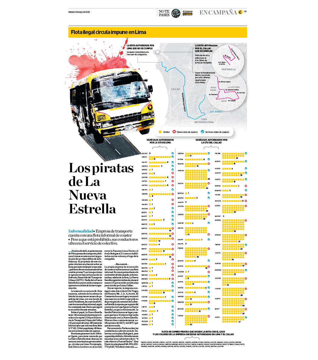 Diez compañías deben más de S/45 millones en infracciones. En primer lugar, se ubica La Nueva Estrella que adeuda al SAT cerca de S/8 millones en papeletas, tiene más de 40 unidades con órdenes de captura y opera con una flota pirata. Pese a todo, en la última gestión del ex alcalde de Lima, Luis Castañeda, se renovó en dos oportunidades la autorización de todas estas empresas y en lugar de limitar el ingreso de combis y coasters a la ciudad, se inscribieron 4.665 vehículos de transporte público, al ritmo de tres unidades cada 24 horas y al menos una de ellas era una combi.