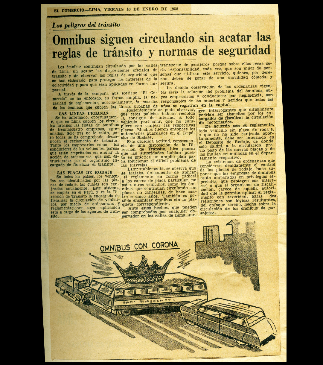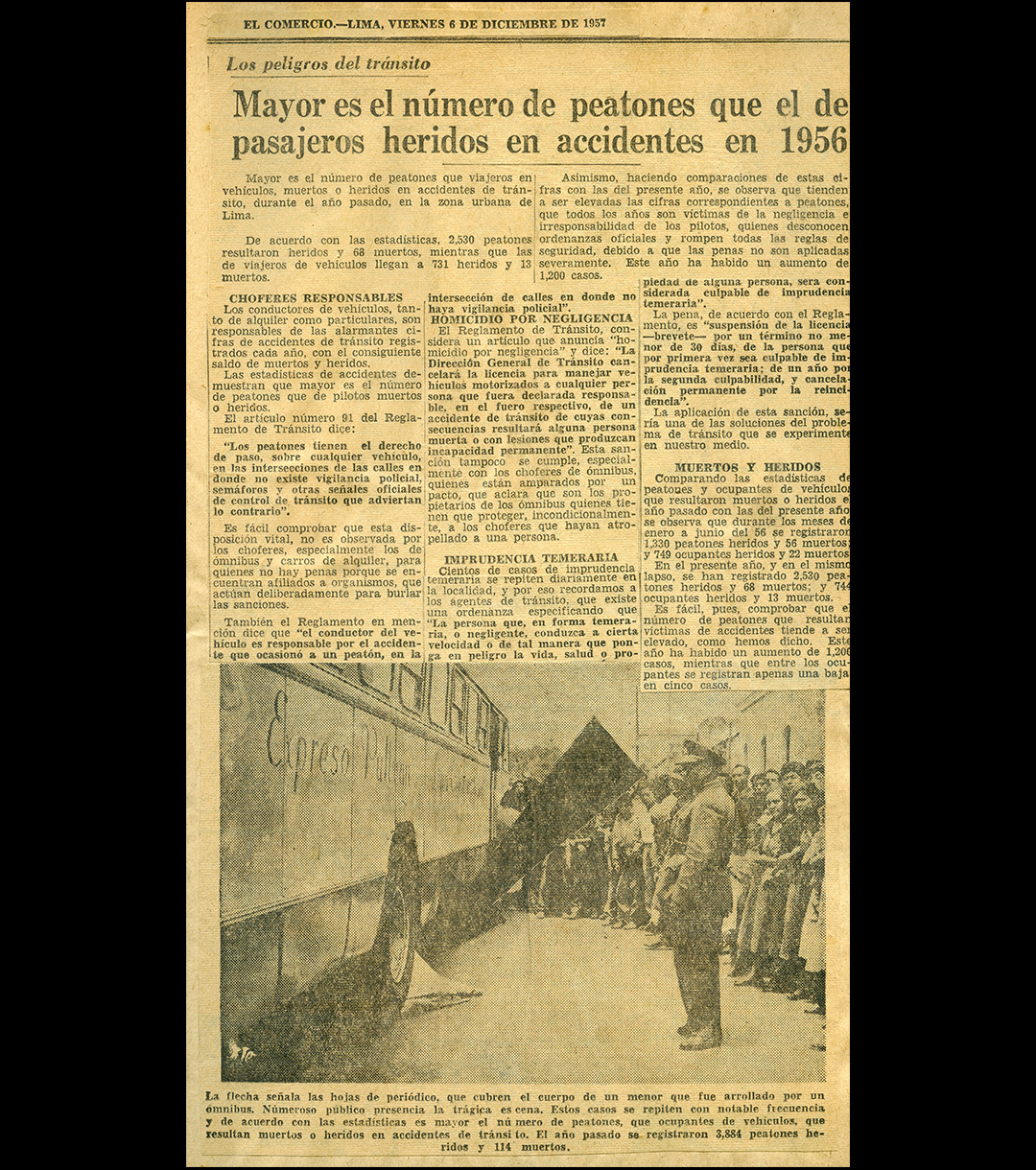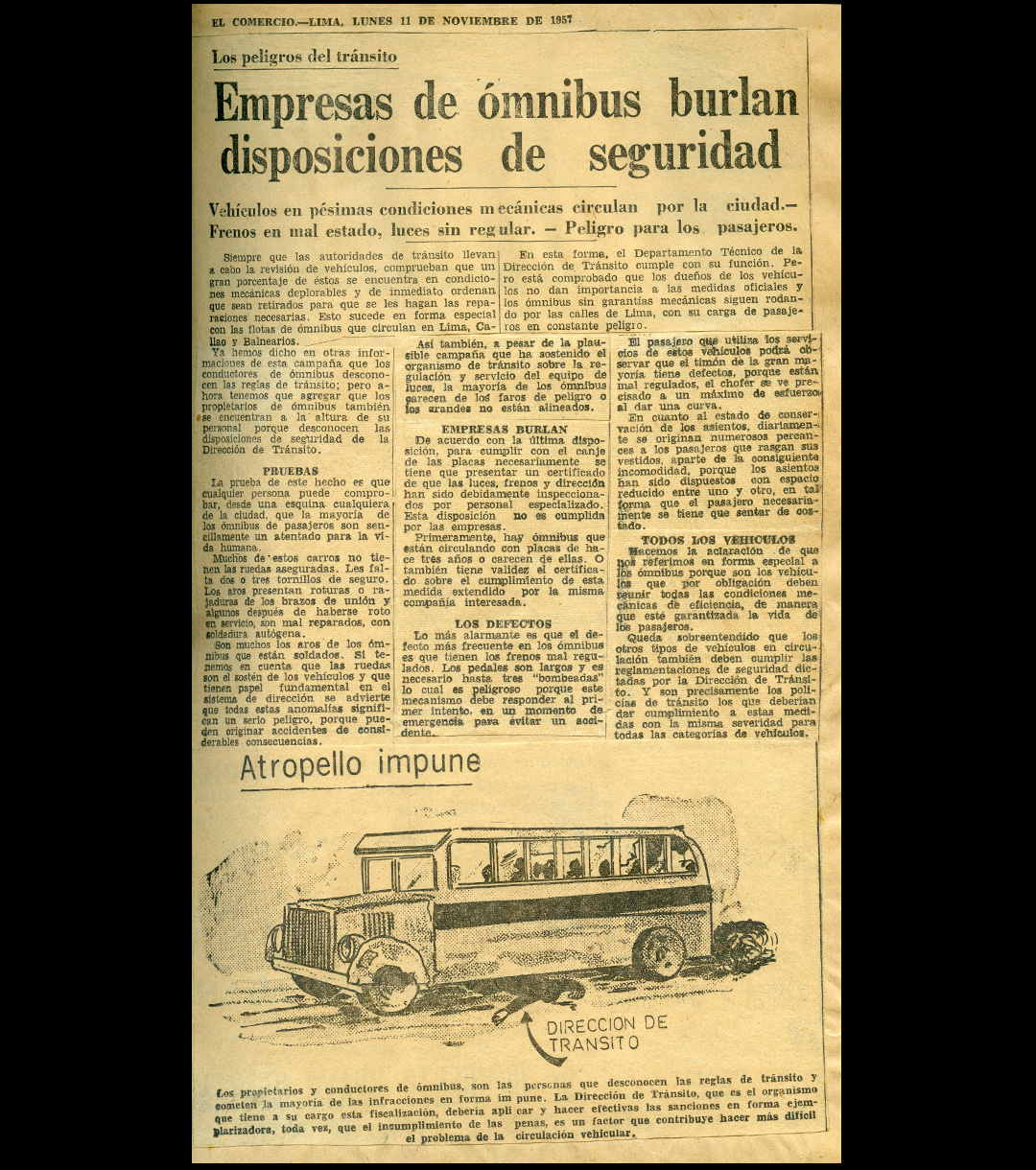Pero reglamento se hizo letra muerta. En 1957, El Comercio lanzó una campaña llamada “Los peligros del tránsito” para denunciar a los principales infractores. Al revisar esos 73 informes y al compararlos con los 330 que hemos publicado en  #NoTePases, llegamos a la conclusión de que no hemos cambiado nada. Son los mismos problemas y los mismos protagonistas. Revise usted mismo nuestro pasado irresuelto.